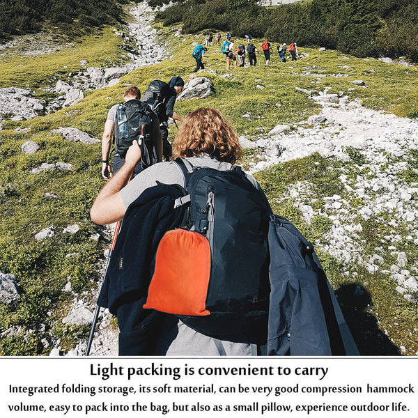 5. ONE INSIDE BAG & ONE OUTSIDE BAG -- The outside bag is used for holding the hammock after being used, and the inside one can be stuffed in many things such as your cell phone, water, food and so on.